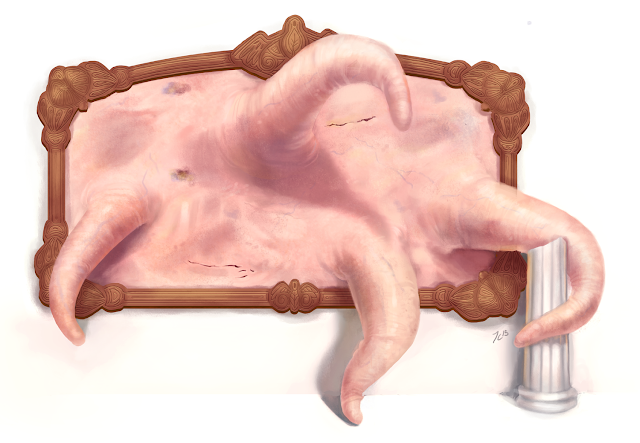 Flesh Paintings were created by a cabal of wizard in ages long ago. These wizards practiced a form of magic called skincrafting. They fused objects and aberrations of flesh into new species. The Flesh Painting were created to be spies and assassins for these wizards. These creatures have the ability to mimic any painting or portrait. They were given to enemies as gifts. There they spied on them and waited for a time to strike. When the time was right four massive tentacles emerge from the painting to squeeze the life out of their victims.